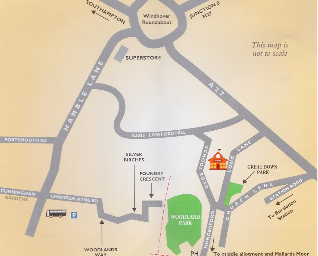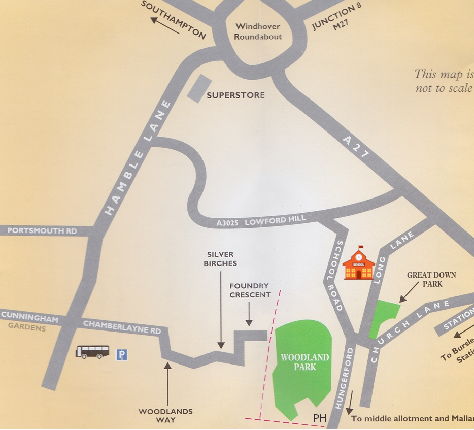 From the west (Hamble and Pilands), the park can be accessed on foot via Foundry Crescent. If coming by car, we recommend parking in the car park shown, just off Chamberlayne Road, next to St Paul's Church.